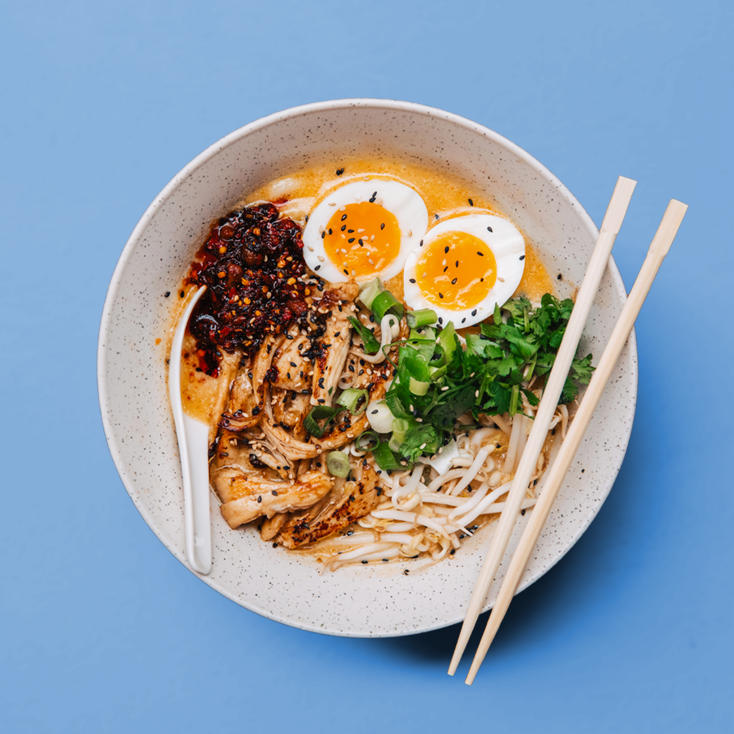 Tori Paitan (Creamy Chicken Broth), Teriyaki Chicken, Udon Noodle, Softboiled Egg, Bean Sprout, Crispy Chili in Oil, Coriander, Sesame Seed, Spring Onion