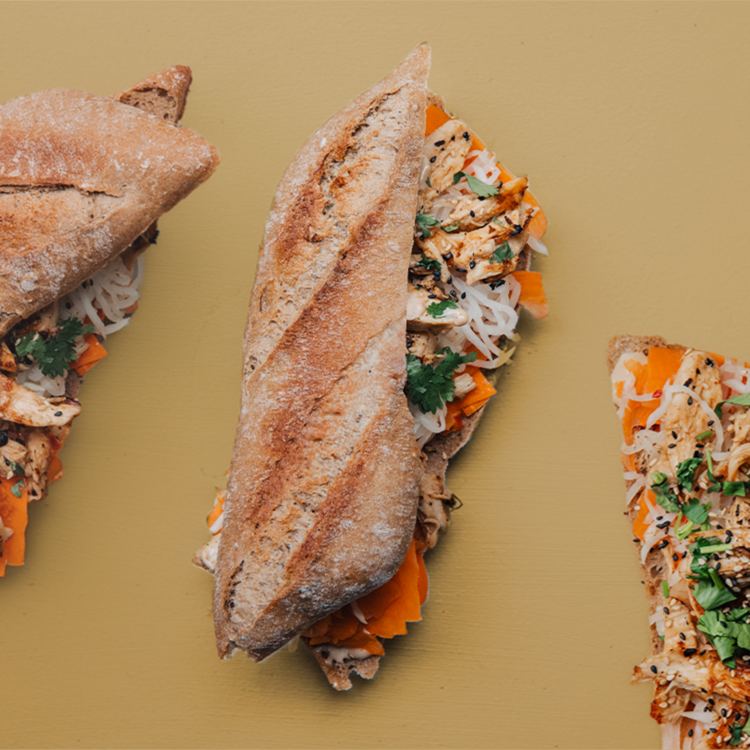 Valgfri Main, Baguette, Hoisin Mayo, Sriracha, Gulerod, Syltede Kinaradise, Sesamfrø, Forårsløg, Koriander