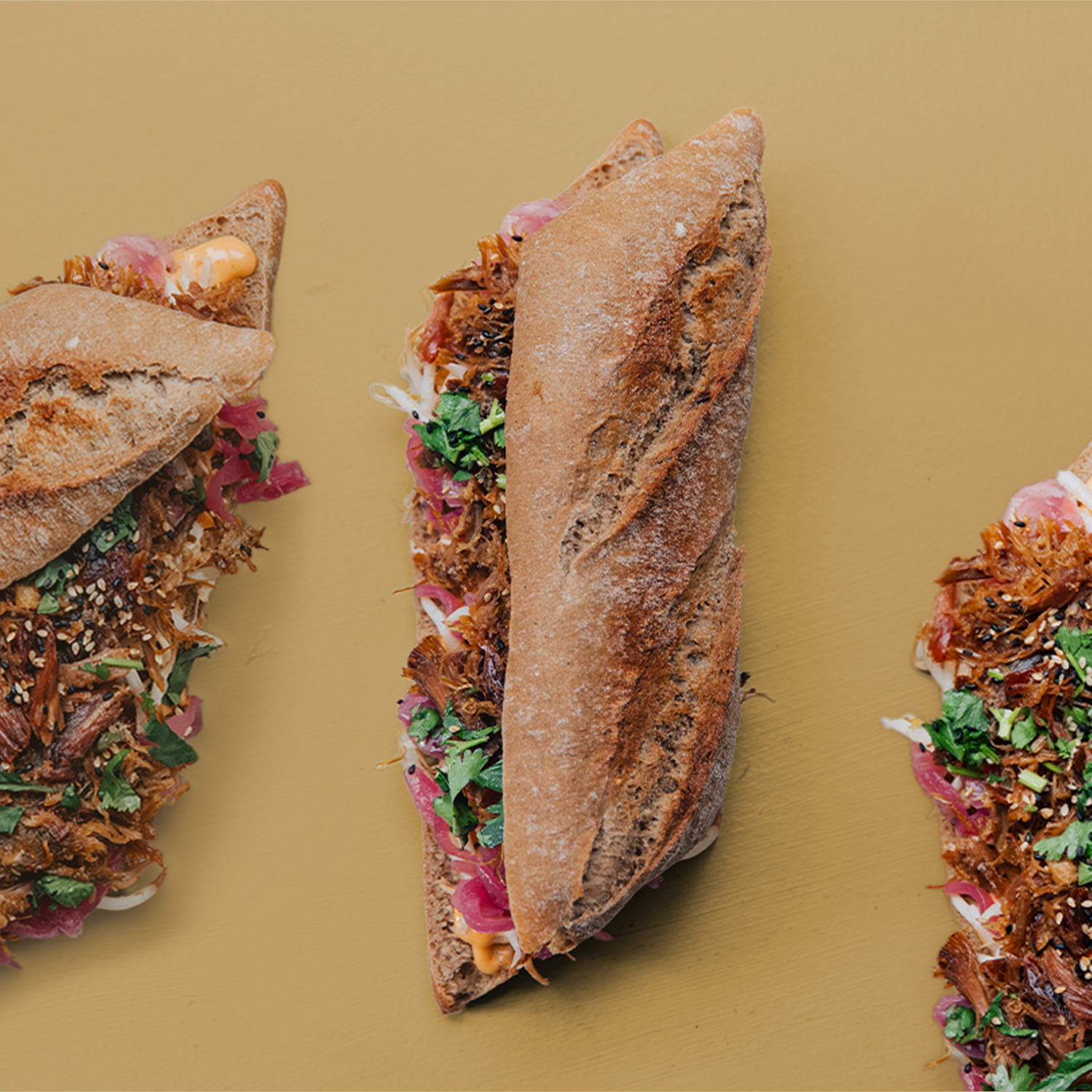 Valgfri Main, Baguette, Chili Mayo, Sriracha, Bønnespirer, Syltede Rødløg, Sesamfrø, Forårsløg, Koriander